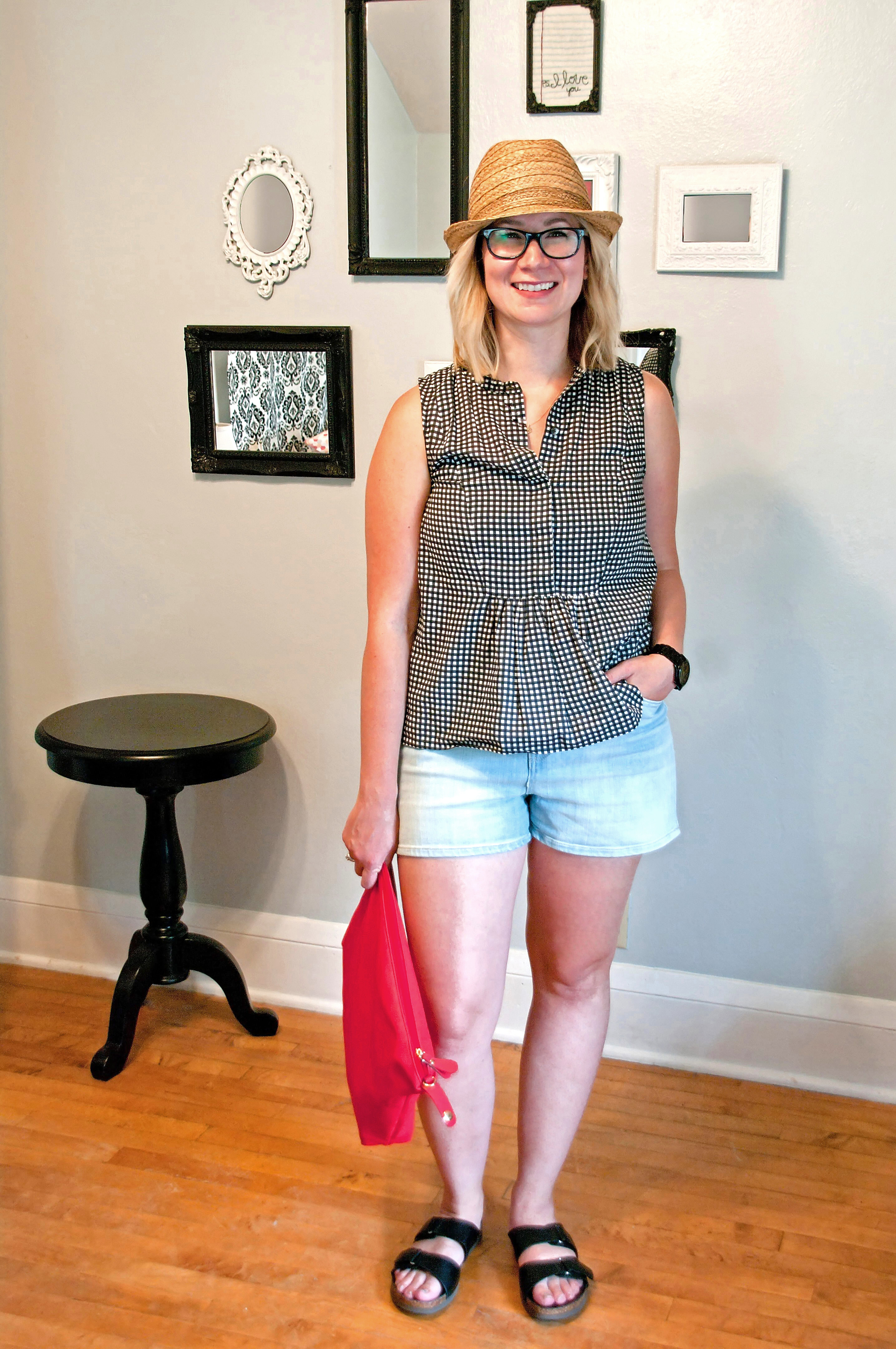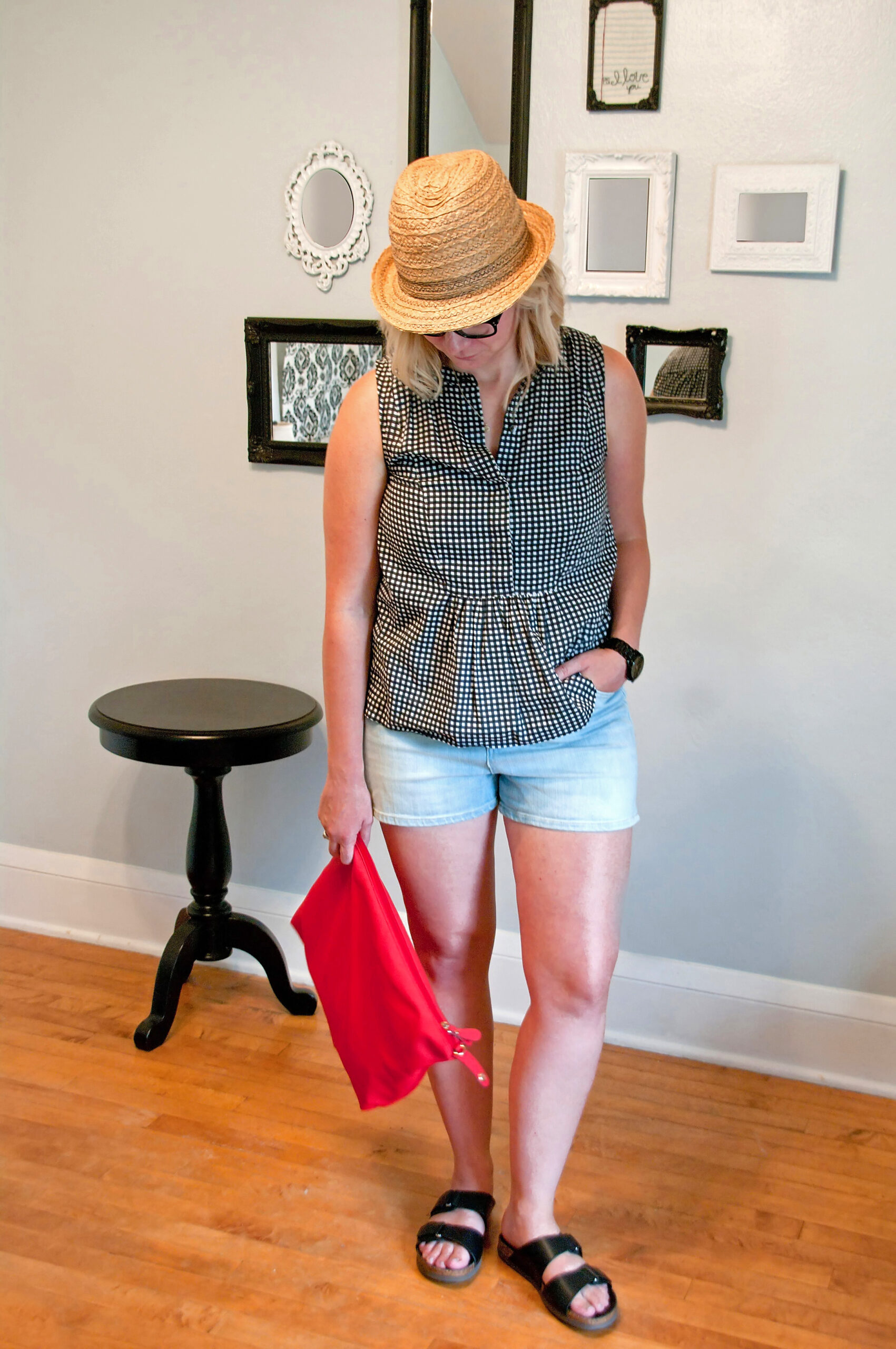 Hat: Old Gap. Similar | Blouse: Old Madewell. Similar | Shorts: Old Old Navy. Similar | Watch: Michael Kors | Clutch: Thrifted. Similar | Shoes: Old Old Navy. Similar