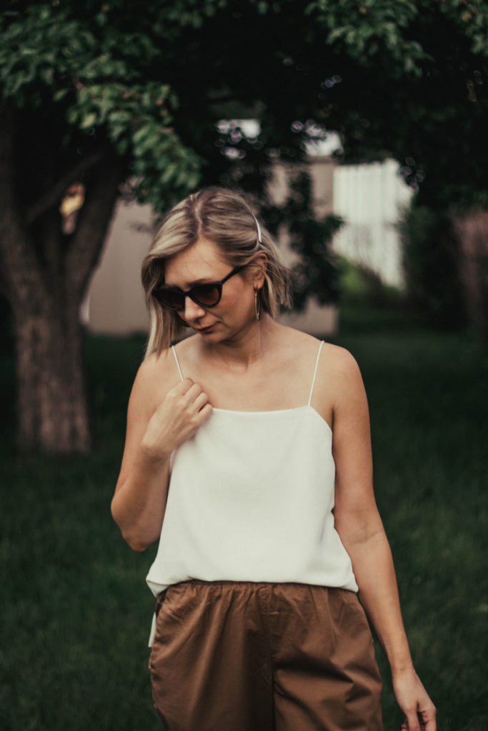 The three pieces that they sent to me to review for you guys are the Japanese Go Weave Cami, the Easy Chino, and the Modern Buckle Sandal.