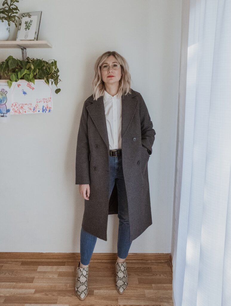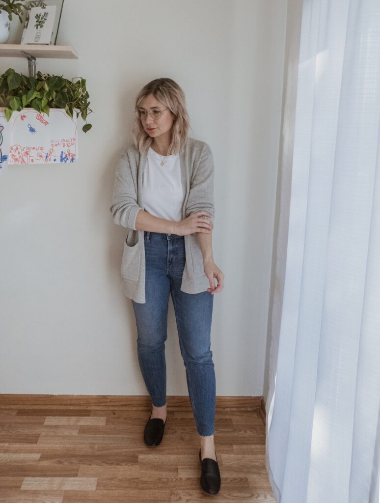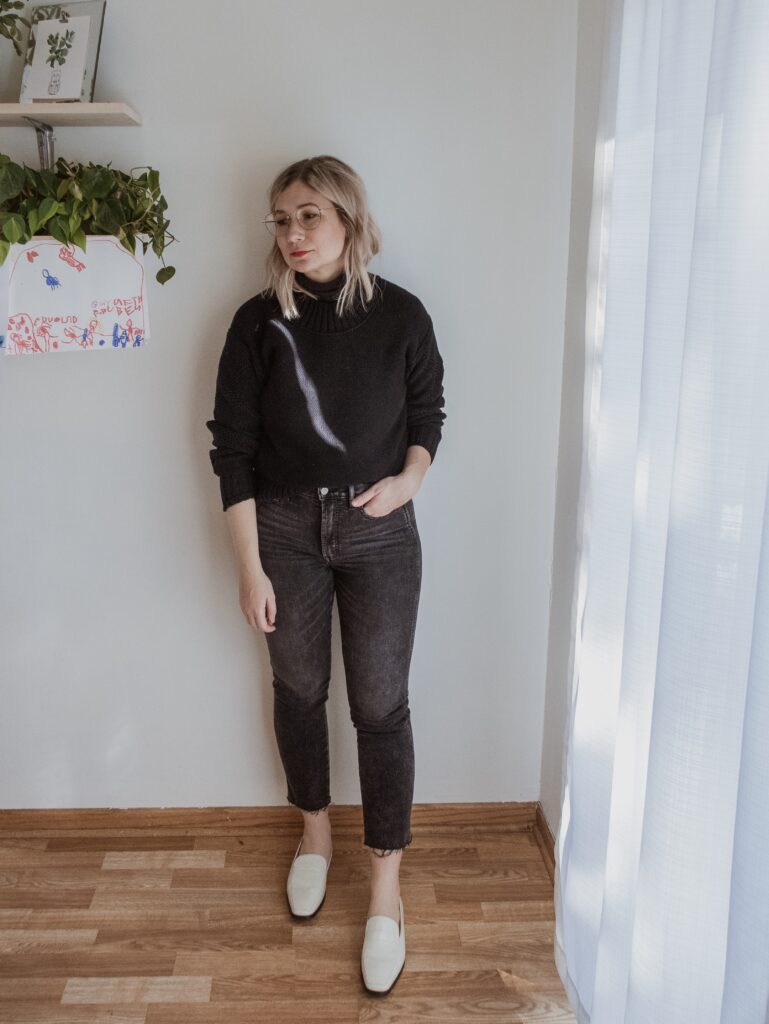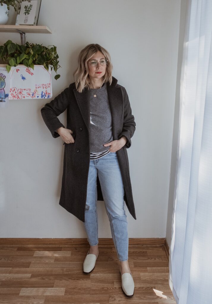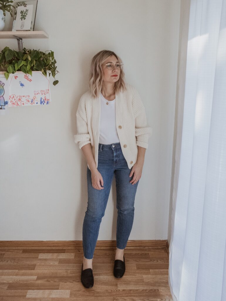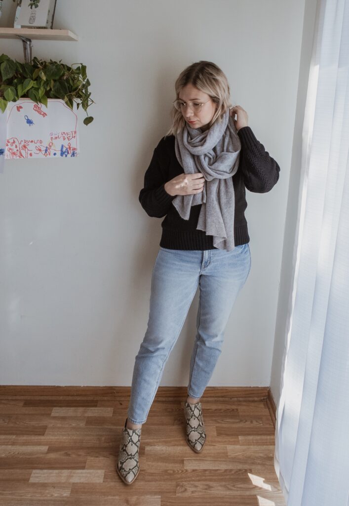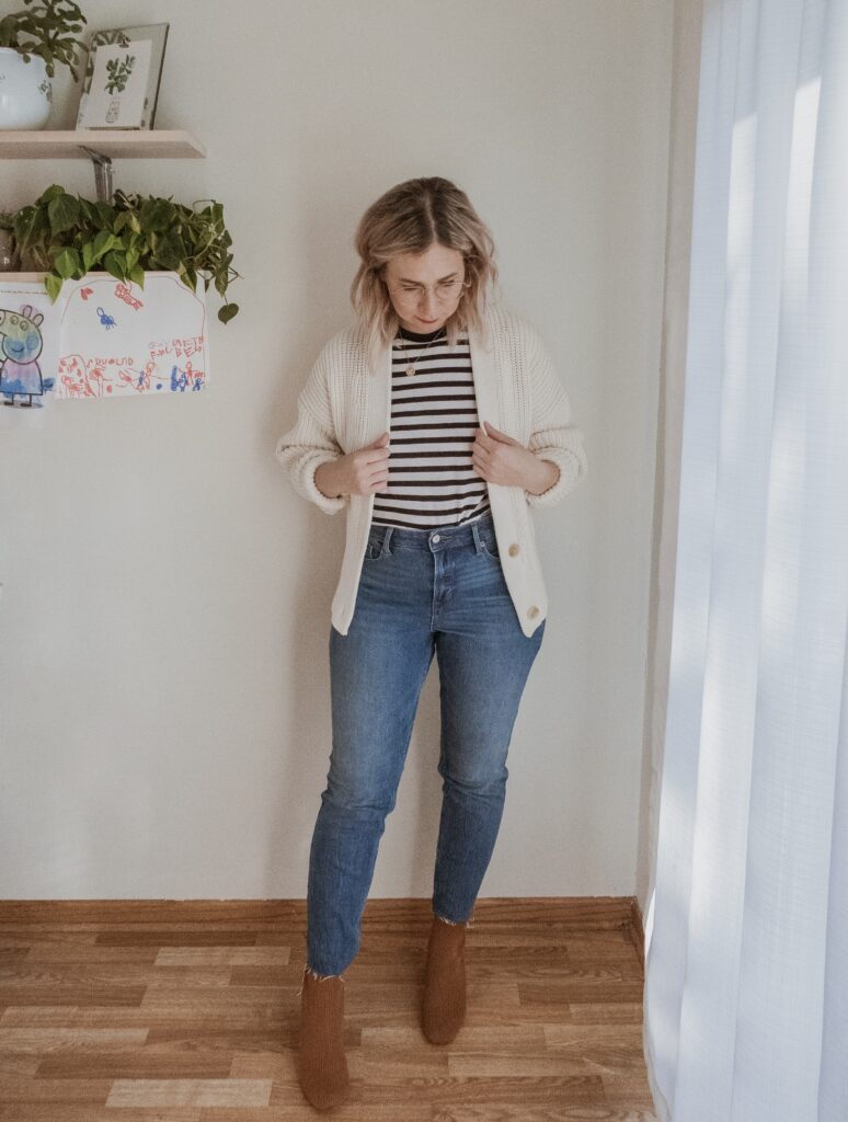 For example: denim. I am nowhere near my typical denim size and I only had one pair in my wardrobe that sort of fit. But I also recognized that a few pairs of denim would make a big difference in my overall confidence so I bought a few pairs in a bigger size.