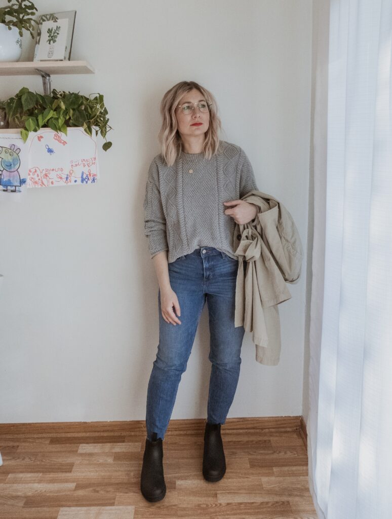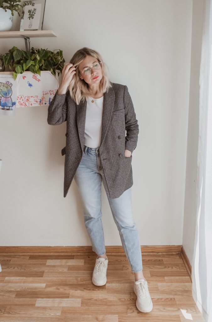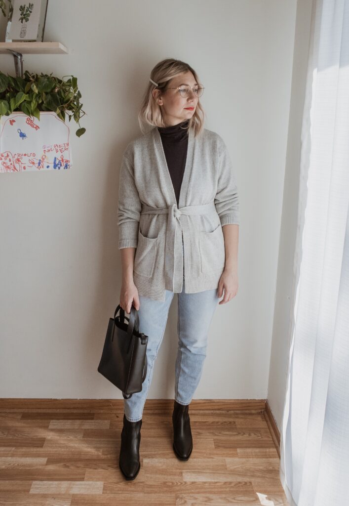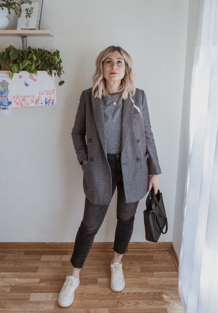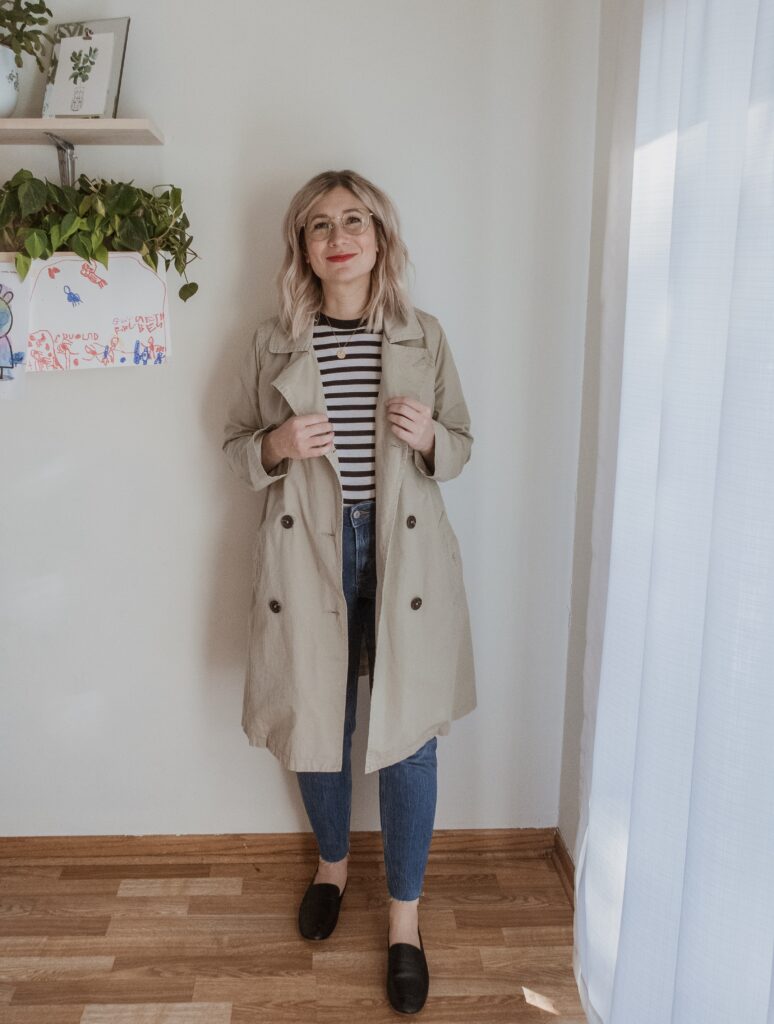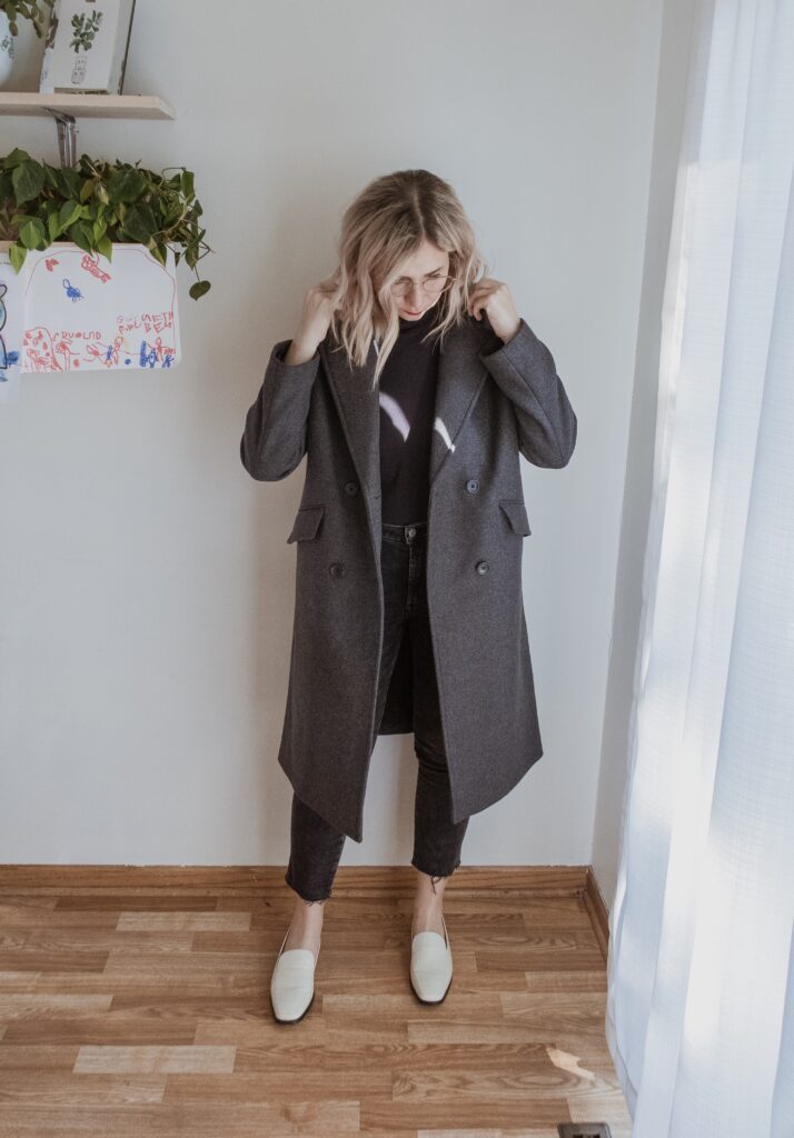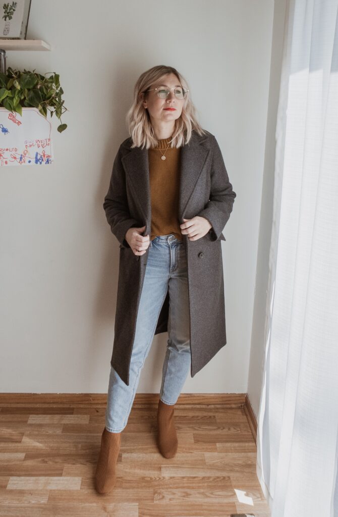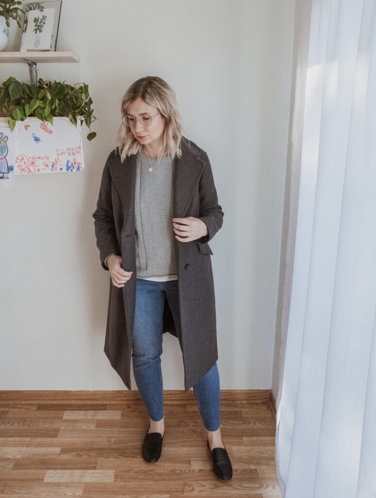 For example: denim. I am nowhere near my typical denim size and I only had one pair in my wardrobe that sort of fit. But I also recognized that a few pairs of denim would make a big difference in my overall confidence so I bought a few pairs in a bigger size.