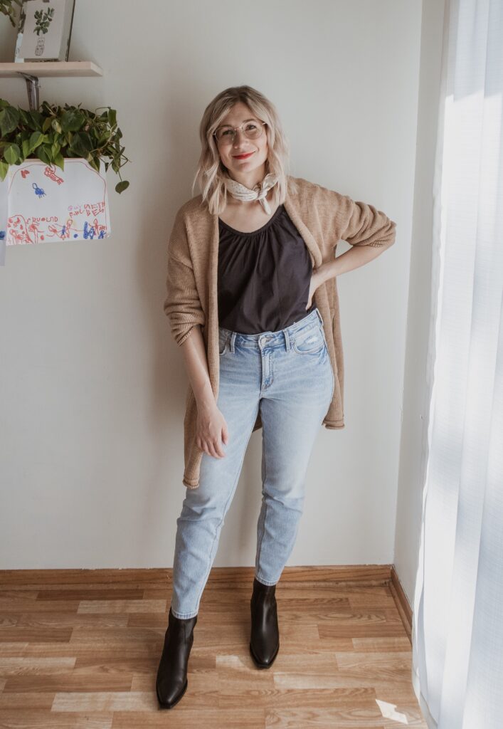 I know I show a lot of sustainable clothing options here, but I did choose to shop from Gap & Old Navy. Why? Because they were more affordable (with the discounts they offer) and fit into my budget better. I know that’s not the most sustainable option, but it’s real life. Funny thing though, I actually REALLY love the pairs I picked up so I’ll probably have them taken in at the waist if I lose weight.