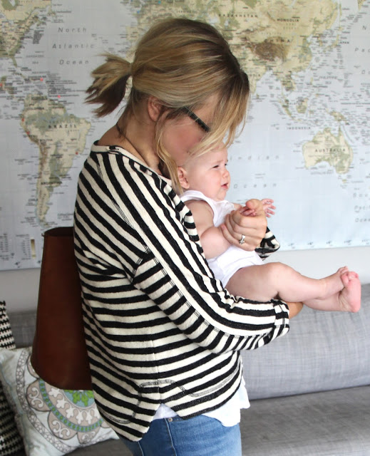 My husband always says that I’m in my element when I’m wearing comfy clothing (what does that say about me?). But… he’s right. I’m all about that loungewear life. What I love about this outfit is that if feels like pajamas, but the pattern and texture of the sweatshirt makes it look more pulled together. Insert a High Five here. Also, funny story, but that’s my dog Oscar in the picture above. I don’t know if you can tell, but in the picture he is in the process of throwing up the peanut butter sandwich that my niece fed him. We have fun in the Rambo household.