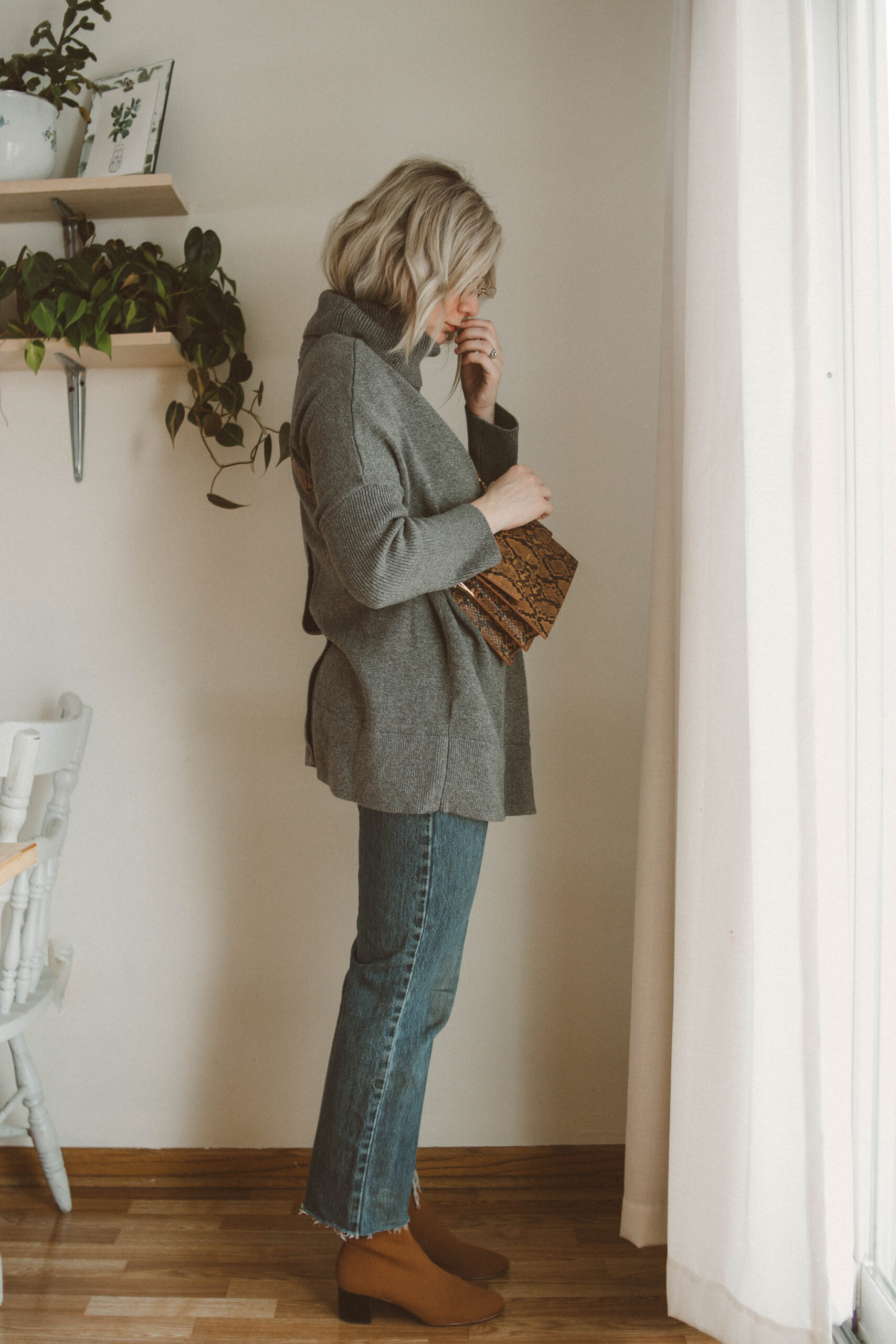 I love every piece in this outfit. The softest, most cozy over-sized sweater (did I mention it has a detachable turtleneck??), my favorite pair of vintage Levi’s, and the comfiest sock boots. THIS IS MY KIND OF OUTFIT. The kind where you feel like you’re wearing pajamas, but (shhh) you’re not.